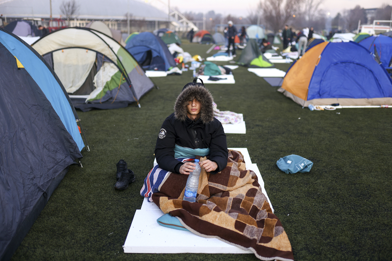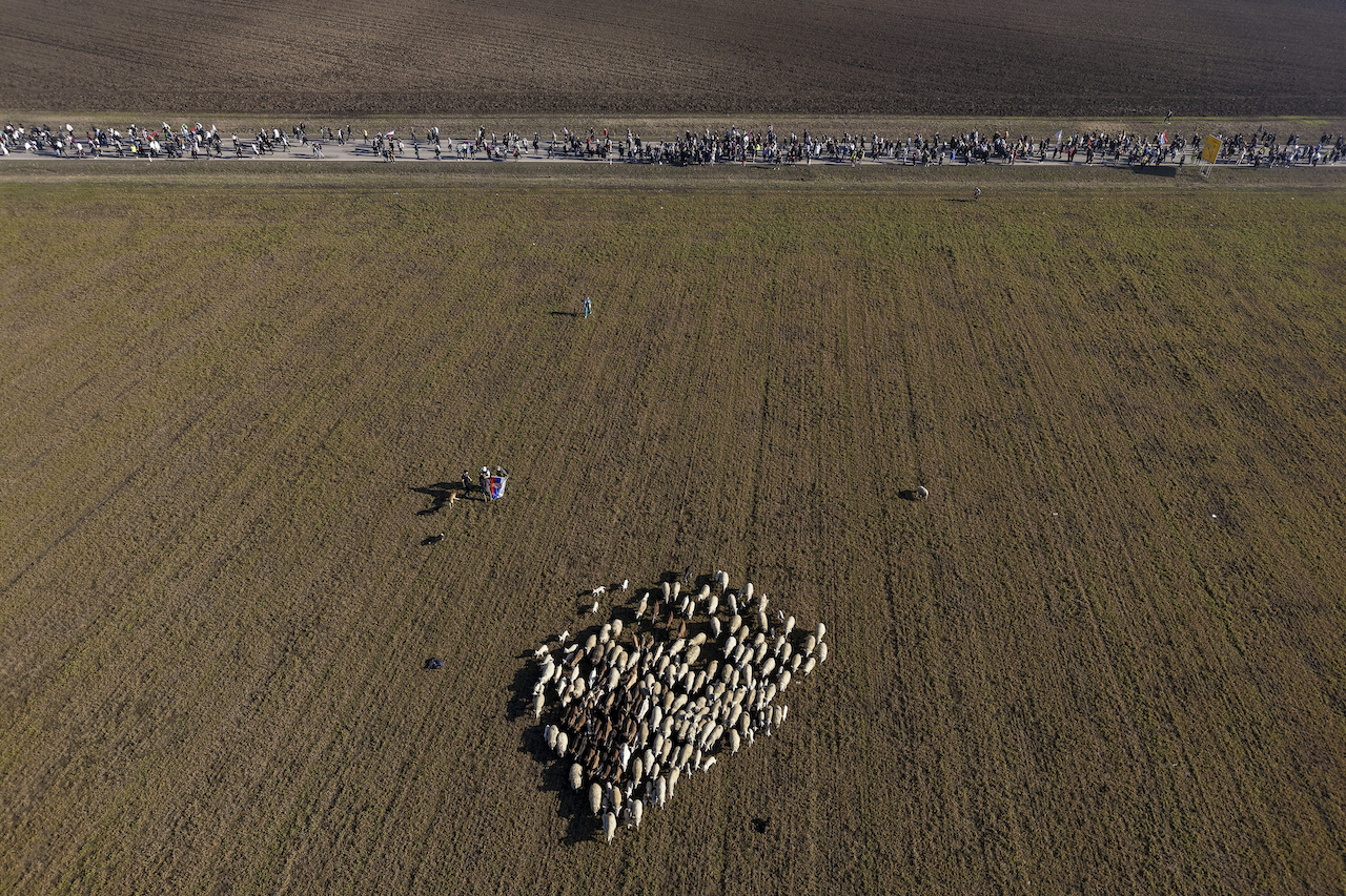Sheep graze as students march trough the fields in northern Serbia to protest over the collapse of a concrete canopy that killed 15 people more than two months ago, in Indjija, Serbia, Friday, Jan. 31, 2025. (AP Photo/Armin Durgut)