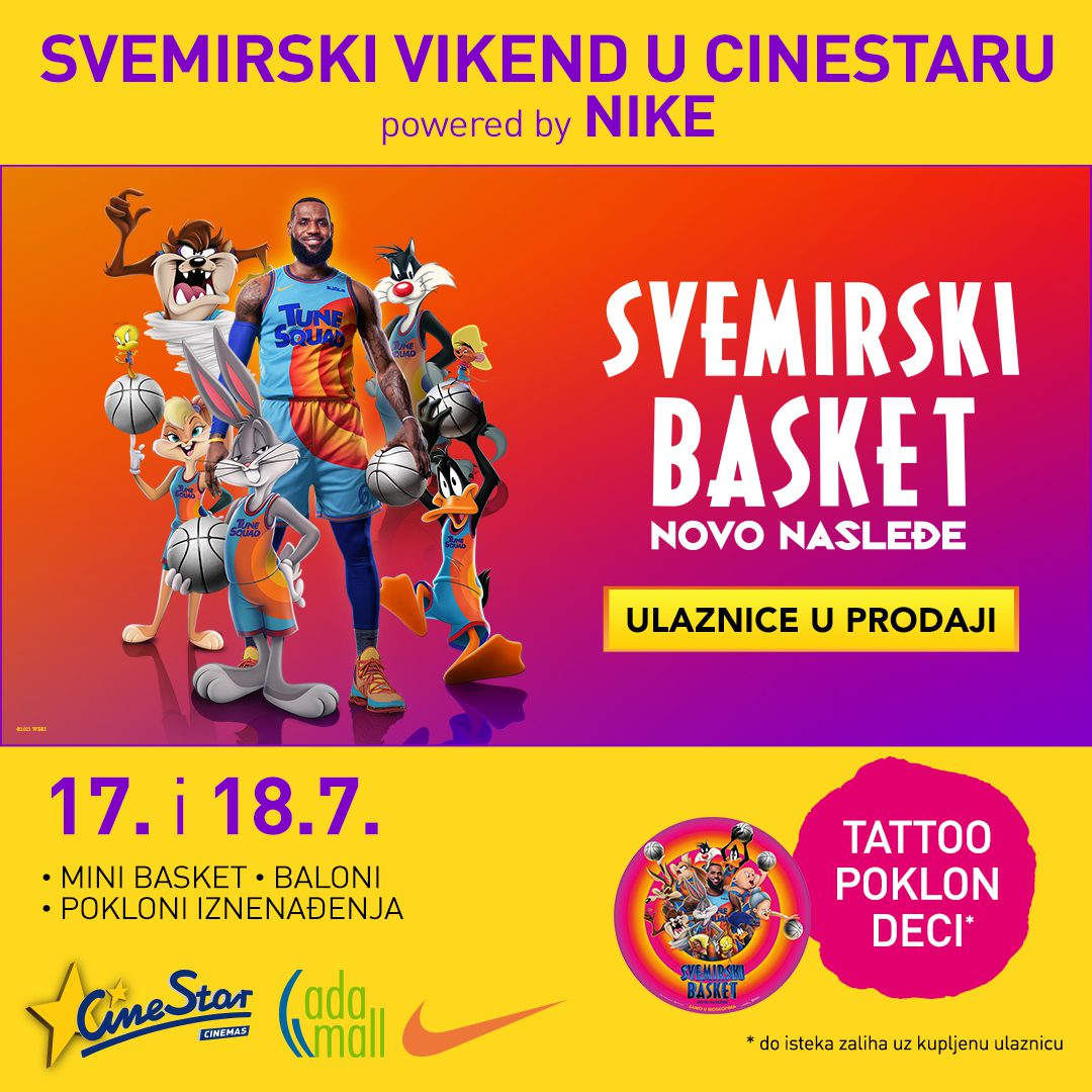 Animirani blokbaster SVEMIRSKI BASKET – NOVO NASLEĐE stigao je na repertoar najboljeg bioskopa u Beogradu, CINESTAR u ADA MALL-u. Tim povodom, ne propustite i Svemirski vikend 17. i 18. jula jer vas osim projekcije filma, očekuje i brdo iznenađenja. Pored poklon tatoo nalepnice, balona za decu i druženja s maskotama, za najsrećnije tu su čak i gadgeti iz filma ispod sedišta i Jokićevi dresovi! Deca će dodatno uživati u bojankama “Svemirski basket: novo nasleđe” i tako osvojiti vredne nagrade!