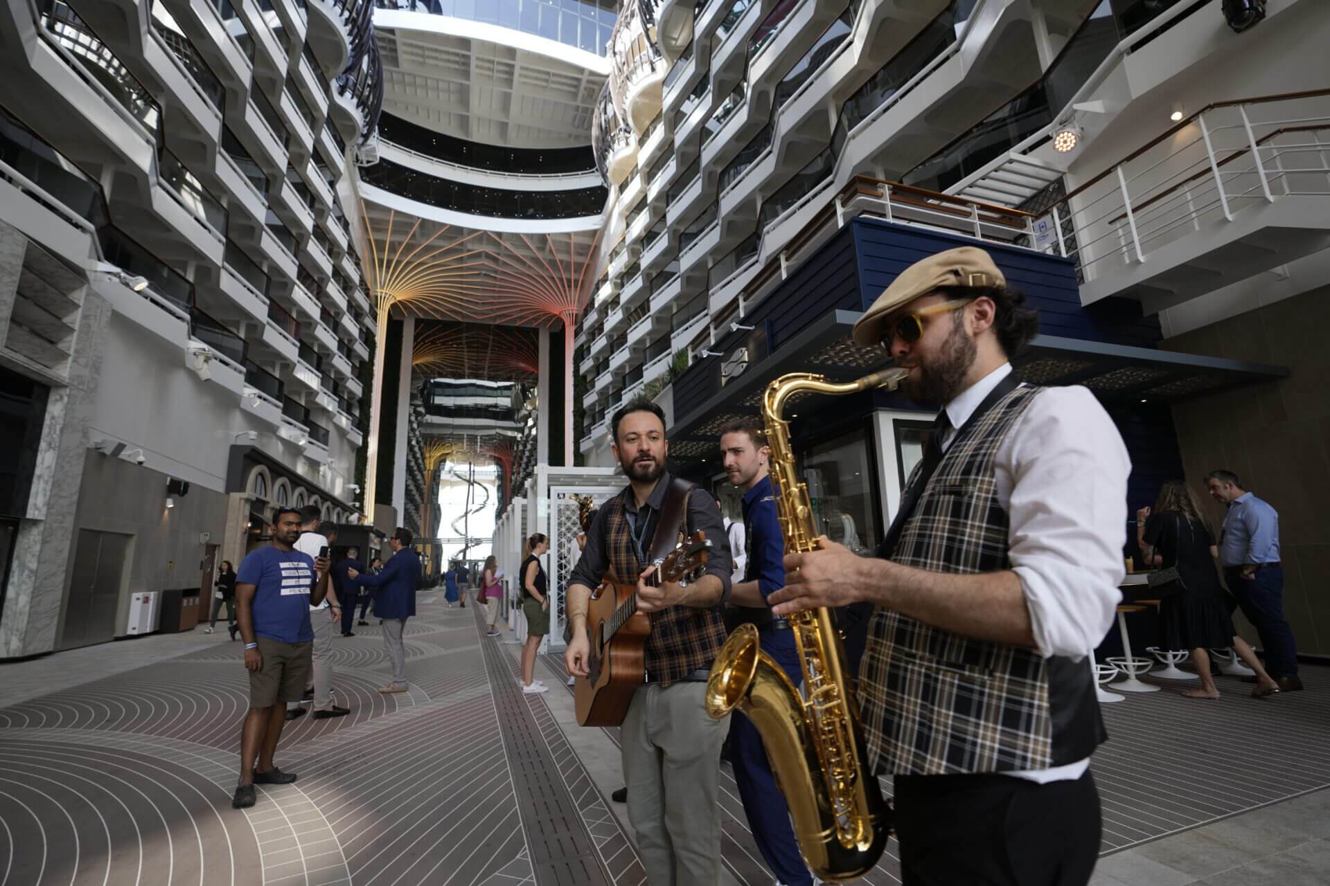 A band play music for passengers inside the 22-decks cruise ship MSC World Europa, a floating hotel docked at Doha Port to offer accommodate for around 6,700 World Cup fans, in Doha, Qatar, Sunday, Nov. 13, 2022. Final preparations are being made for the soccer World Cup which starts on Nov. 20 when Qatar face Ecuador. (AP Photo/Hassan Ammar)