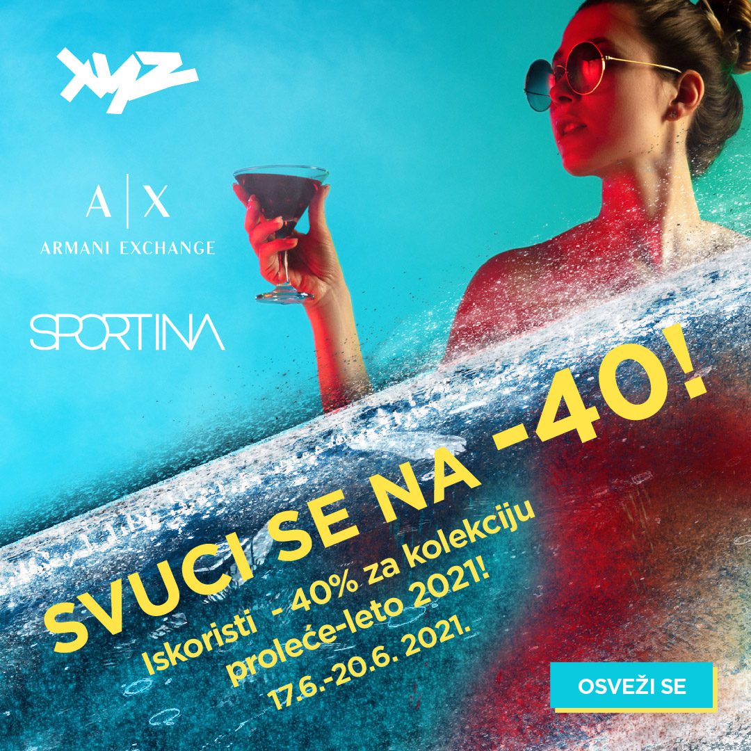 Čeka te primamljiv poziv koji će te ovog puta modno oduševiti: svuci se na -40 i kupuj sa 40% popusta! Izaberi stajlinge koje celo leto nećeš poželeti da skineš. Letnja kolekcija poznatih modnih brendova očekuje te sa 40% popusta u radnjama XYZ, ARMANI EXCHANGE, SPORTINA kao i u internet prodavnici rs.shop.xyz.fashion.