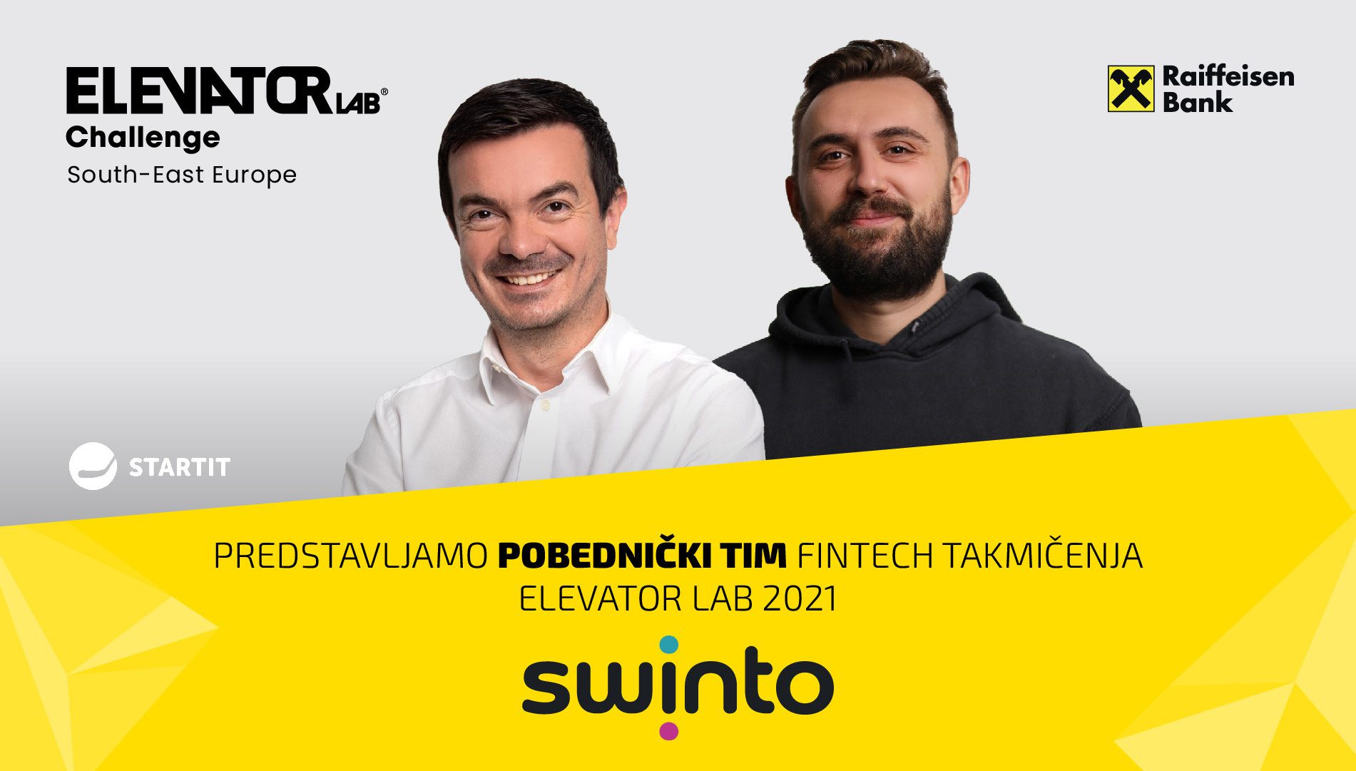 Kao pobednik ovog fintech takmičenja izabran je tim Swinto koji će imati priliku da se predstavi na međunarodnom Elevator Lab Demo Day-u na proleće 2022. godine, da upozna rukovodstvo Raiffeisen Bank International grupacije i dobije stručne savete o poslovnim prezentacijama i jedinstvenim načinima predstavljanja poslovnim klijentima.