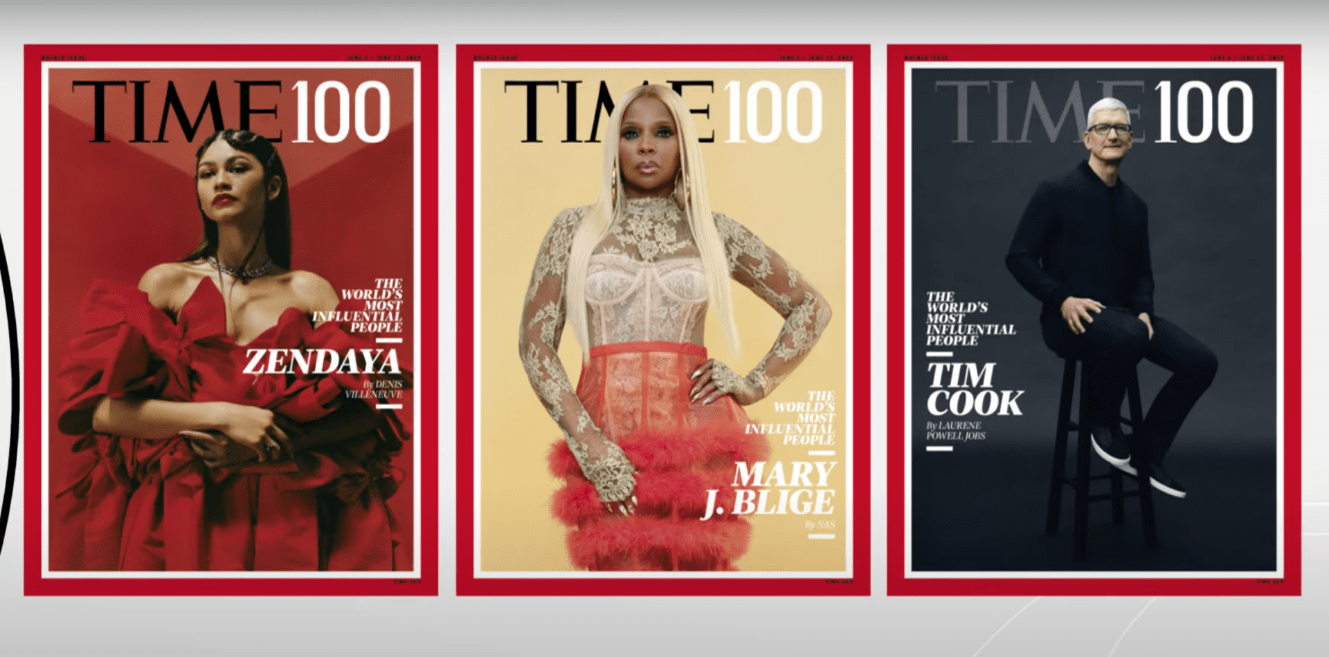 Izdanje sa pet naslovnica ističe članove TIME100 i to glumcu Zendaju, izvršnog direktora Apple-a Tim Kuka, izvođača Meri Džej Blajdž, premijerku Barbadosa Miju Motli i glumca Simu Liu.