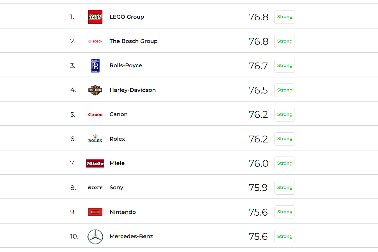 Na prvom mestu s najboljom ocenom, 76,8, ponovo se našao LEGO Group, kompanija za proizvodnju igračaka sa sedištem u Bilundu, u Danskoj, koja je najpoznatija po proizvodnji igračaka marke LEGO.