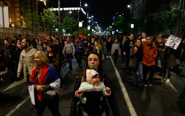 Prva grupa od više hiljada ljudi je ispred zgrade predsedništva Srbije na Andrićevom vencu zapalila baklje, dok je druga grupa od takođe više hiljada ljudi, na čelu s dobošarima, nosila transparent „Dole diktatura“.