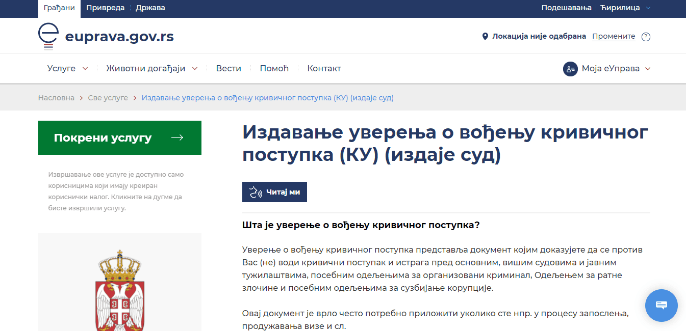 Na Portalu eUprava dostupne su usluge dobijanja Uverenja o vođenju krivičnog postupka za fizička i pravna lica, kao i izdavanje Uverenja iz kaznene evidencije pravnih lica.