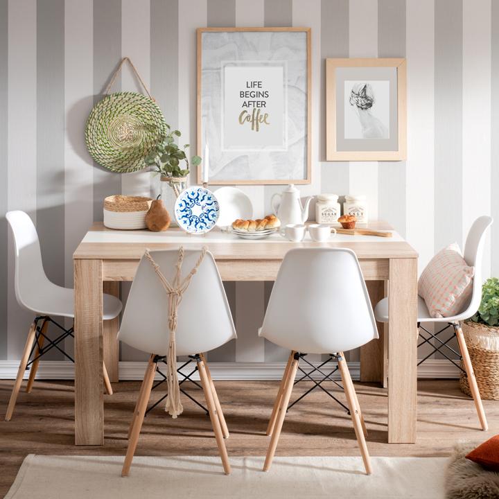 U malo veće trpezarije sjajno možete uklopiti trpezarijske stolice HTC-118 uz prostraniji sto poput trpezarijskog stola DOMUS 135×80, koji odlikuje privlačna kombinacija drveta i belog dekora.