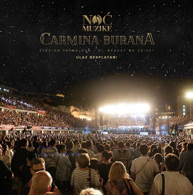 Naše zvezde biće RTS-ov Simfonijski orkestar, Hor, Dečji hor, Kolibri i Akademski hor Obilić. Solisti su Aleksandra Jovanović sopran, Aleksandar Tolimir tenor i Dragutin Matić bariton. Sve njih predvodi maestro Bojan Suđić koji će za vas pod otvorenim nebom izvesti „Karminu Buranu“, najpopularnije delo nemačkog kompozitora Karla Orfa.