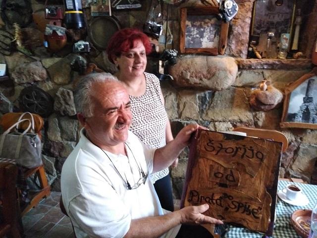 „U konobi redovno svira i moja klapa Spilja. Ja sam tu prateći vokal, ali uživam u muzici. Svaki nastup počinjemo sa pesmom ’Od Vardara pa do Triglava’ jer nas ta pesma podseća na neka lepša vremena. Živeo sam u vreme kada je Jugoslavija bila jedna zemlja. Jesam Crnogorac, ali duša mi je i dalje jugoslovenska. Na spratu na polici imam bistu Josipa Broza, fenjer Draže Mihajlovića, čuturu iz koje je pio Ante Pavelić i violinu koja je poklon od Envera Hodže. Takođe na drugoj polici su i sve svete knjige iznad kojih sam napisao – Mesto koje nas spaja“.