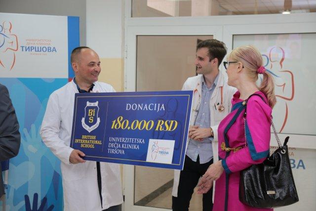 Donaciju je uručila direktorka British International School mr Aleksandra Keserović dr Siniši Dučiću, zameniku direktora Univerzitetske dečje klinike Tiršova.