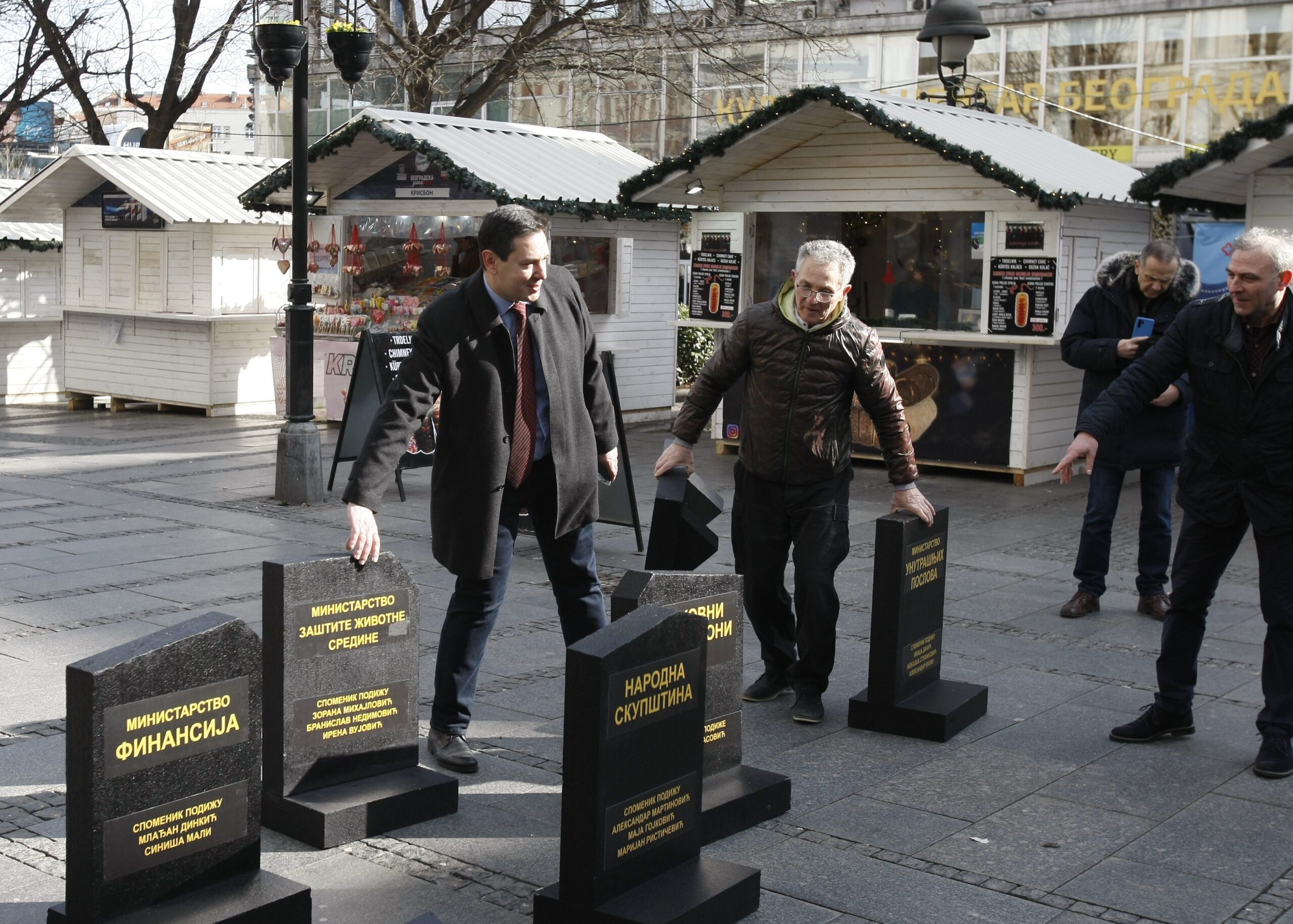Na „nadgrobnim spomenicima“ stajala su imena ministarstava i institucija, uz natpis da spomenik podižu aktuelni predvodnici tih državnih institucija.
