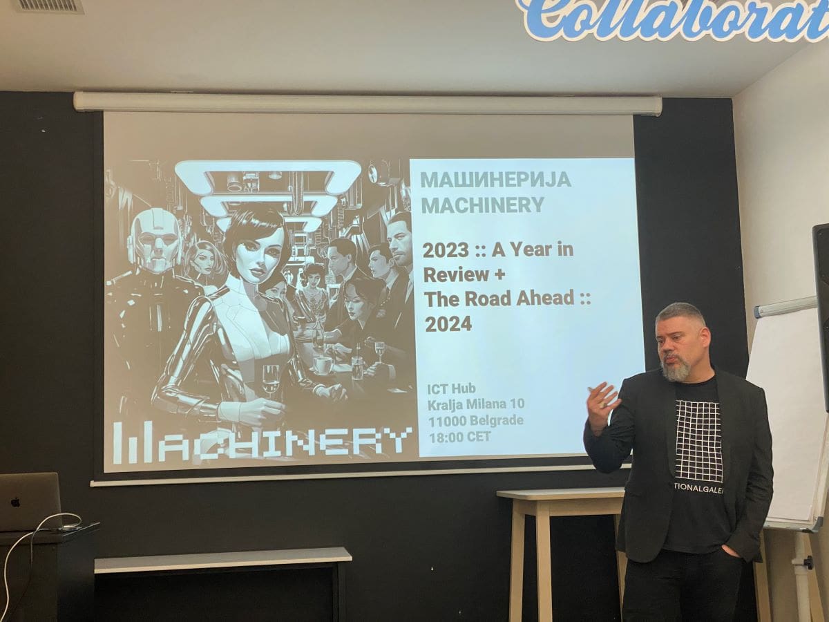 Skup ljudi iz IT sektora je na događaju pod nazivom „MACHINERY A Year in Review + The Road Ahead in 2024.” imao prilike da isprati, diskutuje i komentariše društvene i političke efekte razvoja AI tehnologija, svesni da kao profesionalci u ovoj oblasti imaju dužnost da informišu i obrazuju i javnost o posledicama svog rada.