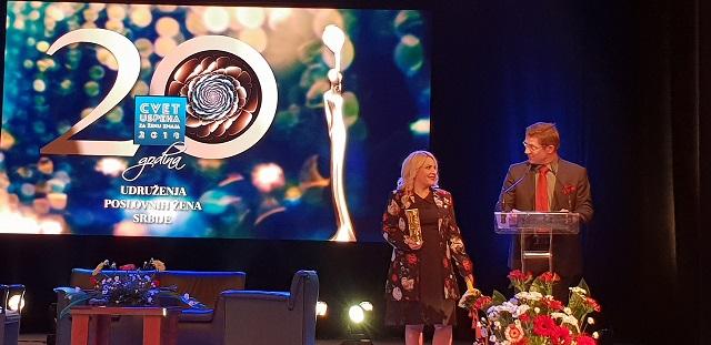 Ta nagrada, koja se prvi put dodeljuje u jubilarnoj 20. godini postojanja Udruženja poslovnih žena Srbije, namenjena je velikim kompanijama koje primenjuju 5. princip Ujedinjenih nacija za osnaživanje žena.