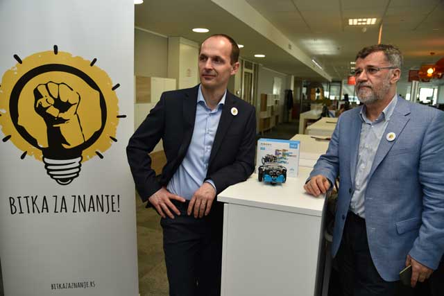 „Neke kompanije odmah su prepoznale važnost ove akcije, a svakako jedna od njih, koja je do sada dala najveću donaciju, jeste Vip mobile u kome smo danas. Neizmerno se zahvaljujemo zaposlenima u Vip-u i nadamo se da će njihov primer podstaći i druge društveno odgovorne kompanije da se uključe u Bitku za znanje, kako bismo što pre uspeli da obezbedimo ove savremene nastavne alate za sve škole u Srbiji“, poručio je Veran Matić.