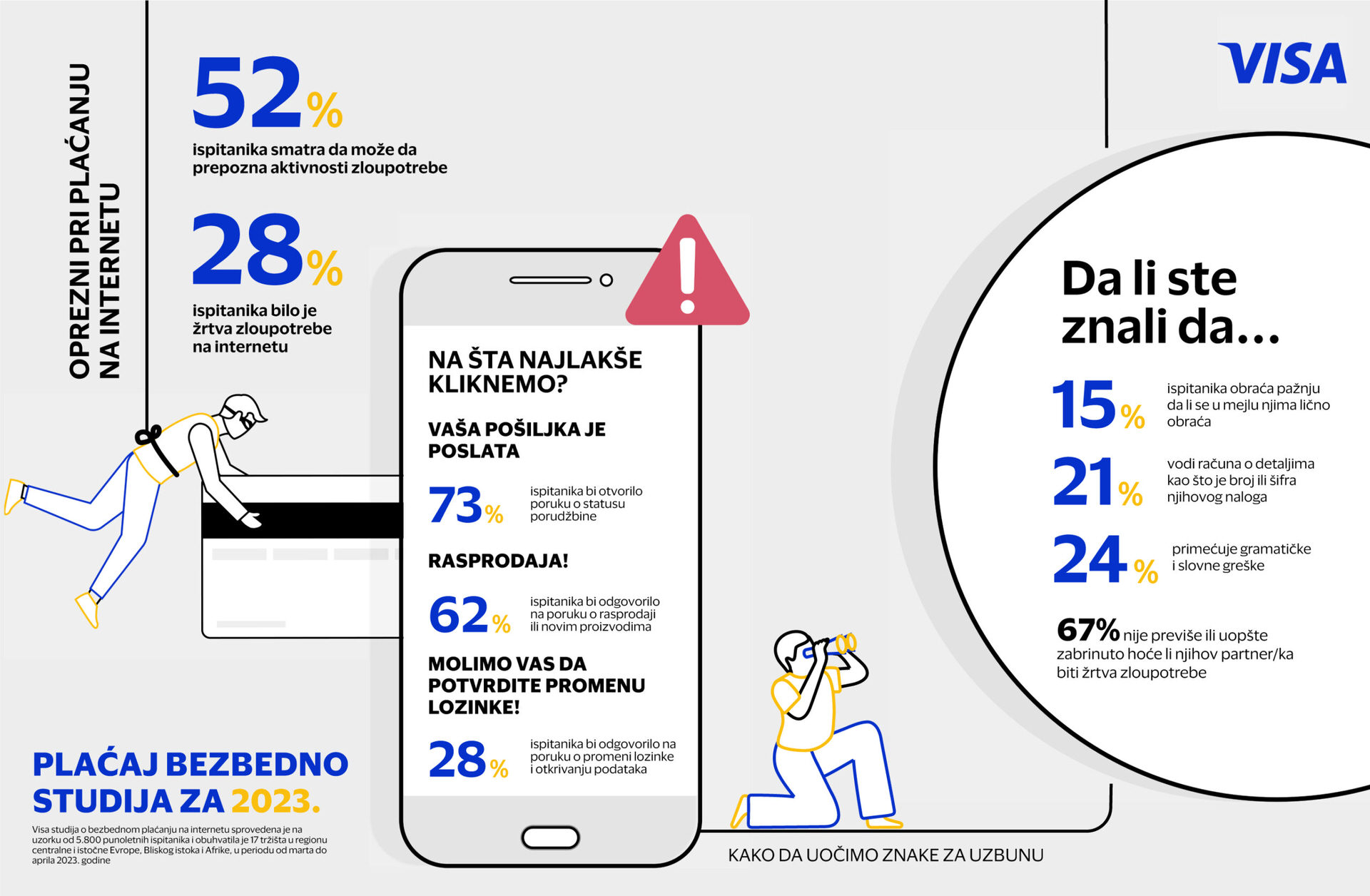 Prema studiji „Plaćaj bezbedno“ kompanije Visa koja analizira bezbednost plaćanja na internetu, građani Srbije su među najopreznijima u regionu kada je reč o zloupotrebama prilikom online kupovine. Više od polovine ispitanika (52 odsto) smatra da su dovoljno edukovani i da mogu da prepoznaju aktivnosti koje ukazuju na potencijalnu zloupotrebu, njih tri četvrtine (75 odsto) sa oprezom tretira poruke o nagradama i nagradnim igrama, besplatnim poklonima i poklon karticama, a skoro isti procenat (73 odsto) sumnja i u autentičnost poruka koje zahtevaju da se promeni lozinka i ažuriraju podaci.