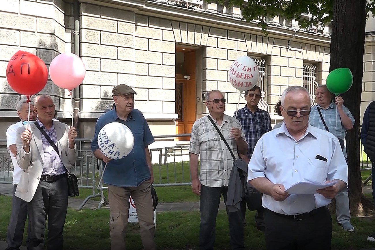 Udruženje sindikata penzionisanih vojnih lica izvelo je ispred Predsedništva Srbije performans „Mi njima vitamine, oni nama poštovanje Ustava i zakona“.