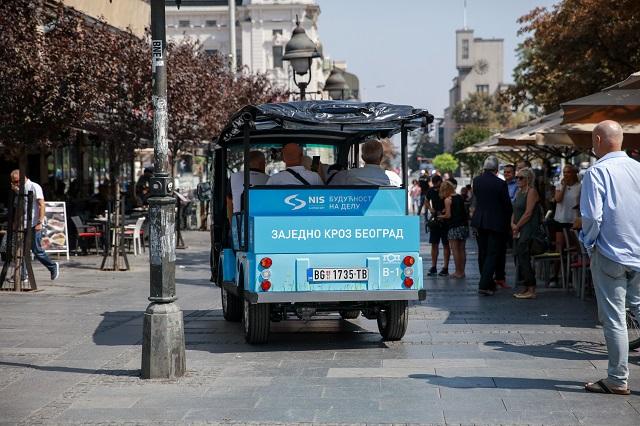 Andreja Mladenović je istakao da Beograd, zahvaljujući kompaniji NIS, na poklon dobija četiri vozila na električni pogon, osposobljena da voze putnike u pešačkim zonama, ali i u aktivnom saobraćaju.