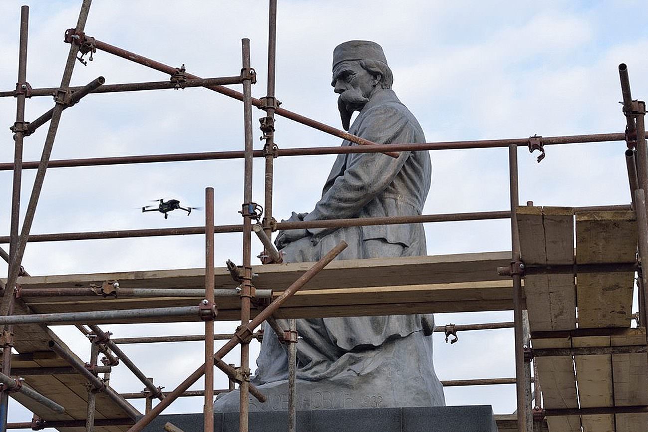 Skulptura, kao i livena slova su oprani spolja i iznutra neabrazivnim metodama i odstranjeni su stari korodirani ankeri, saopšteno je iz Zavoda za zaštitu spomenika kulture Grada Beograda.