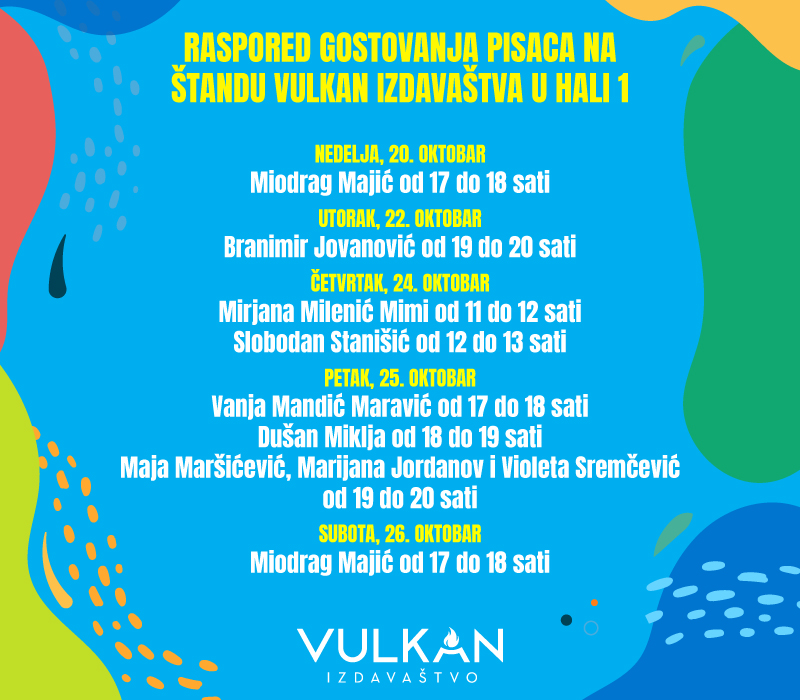 Vulkan izdavaštvo poziva sve čitaoce na nezaboravne dane druženja sa knjigom, i podseća da će tokom najveće književne i kulturne manifestacije u Srbiji i regionu biti organizovani susreti sa piscima koji su oblikovali savremenu književnu scenu.