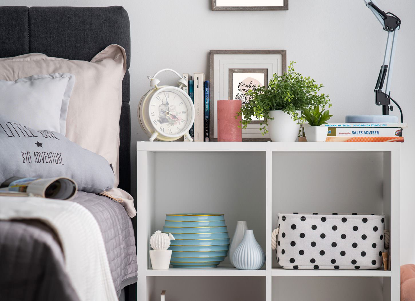Bela je odličan izbor i za spavaće sobe. Osim što unosi mir u ambijent, bela takođe čini prostore većim, što je čini idealnim izborom za male spavaće sobe. Beloj je potrebno dodavanje teksture u ambijente, a u spavaćoj sobi ćete to najlakše uraditi uz pravi odabir ćebadi , prekrivača, jastuka i slično, a pogotovo ukoliko se odlučite za tapacirani francuski ležaj poput ležaja MERI. Uža dimenzija ovog francuskog ležaja pogodna je za opremanje ambijenata spavaćih soba koje raspolažu sa manje prostora, a uz francuski ležaj ne morate uvek dodati noćni ormarić, već možete uklopiti i manju otvorenu policu. Dizajneri enterijera Forma Ideale preporučuju policu MAURO MXXR221, koja je veoma funkcionalna i odlična za dodavanje posebnog pečata kroz dekoraciju. Za dodatne detalje, odaberite platnene korpe sa omiljenim paternom bez bojazni da li će se uklopiti uz zidove i ambijent. Dekoracija takođe može biti raznobojna i zajedno sa lampom i galerijom slika iznad napraviće odličan ukras u beloj spavaćoj sobi.